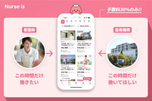 ナースイズは、スキマ時間に働きたい看護師と、人手不足に悩む医療機関や企業をマッチングするプラットフォームです。